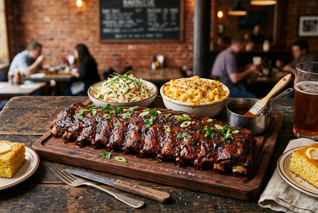 Fresh and crunchy sides help cut through the richness of the ribs. Something acidic, like slaw or pickles, can also brighten the plate.